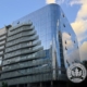 Curtain Wall con diferentes situaciones de continuidad e interrupción (a traves de la estructura). Además construimos una segunda fachada meálica que hace veces de parasol baranda. La misma se materializaba a traves de paños vidriados y perfiles metálicos que le daban un ritmo al conjunto de la envolvente. El proceso contructivo fue por etapas considerando los requerimientos del Estudio Proyectista. Un capítulo especial ha tenido el desarrollo de perfiles curvos por parte de empresa extrusora HYDRO y la eleccción del vidrio con diseño curvo que respondiera a temas estéticos y de control solar y térmico.